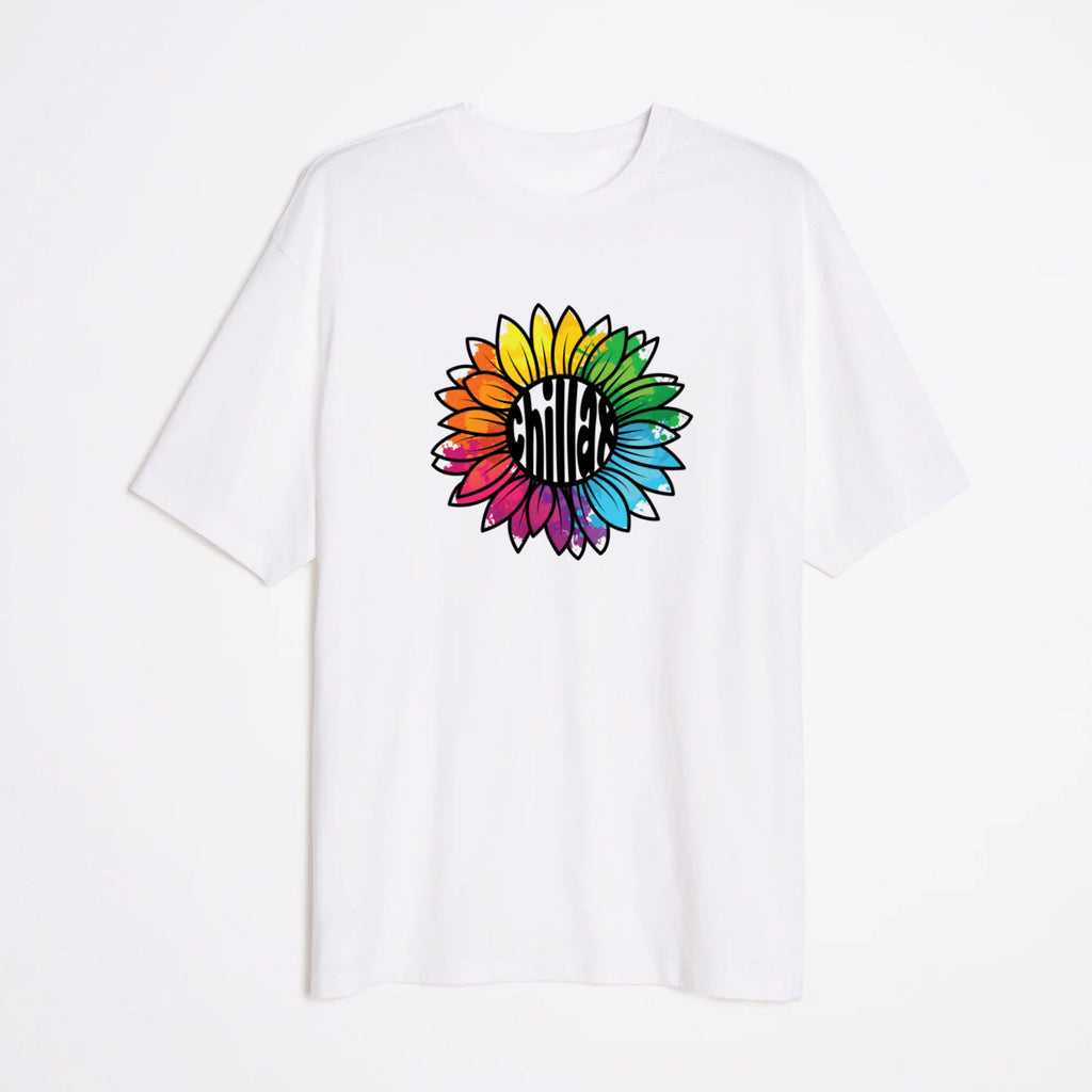 Slip into something as vibrant and carefree as you! Featuring a vibrant sunflower with rainbow-coloured petals and the word Chillax blooming proudly in the center, this white tee is all about spreading sunshine and positivity.