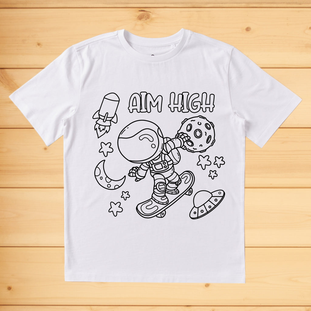 Introducing our 🚀Aim High ☄️ Colour-In T-Shirt! This space-themed shirt features an adventurous astronaut riding a skateboard through the galaxy, gripping a meteor in one hand while surrounded by a moon, stars, and a soaring rocket. It’s the ultimate out-of-this-world design for kids who love cosmic adventures!