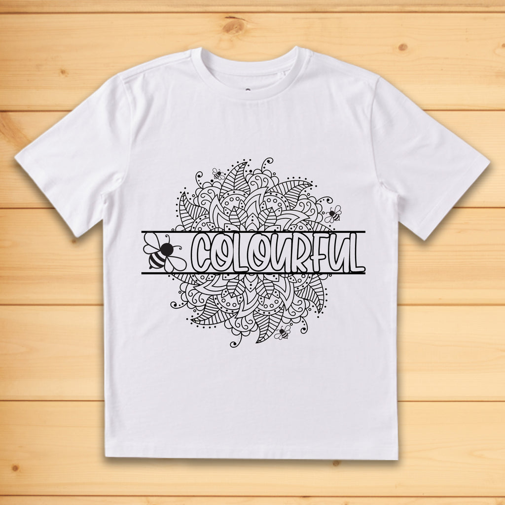 Say hello to our 🌈 Bee Colourful 🐝 Colour-In T-Shirt! This design features a stunning mandala-inspired flower and leaf pattern with a beautifully outlined bee and the word "Colourful" flowing through the center. Scattered around the design are a few charming little bees, adding a touch of whimsy and fun.
